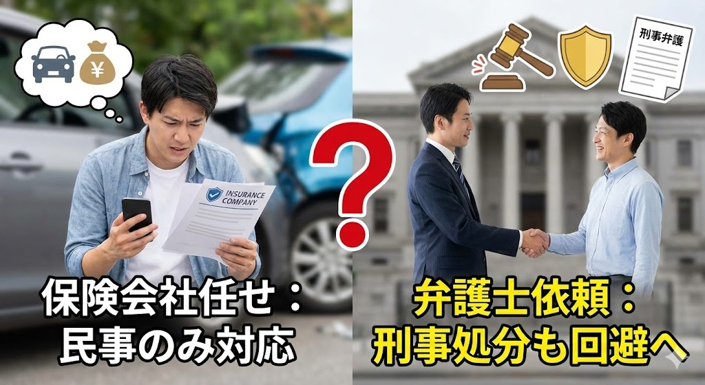 つまり、保険会社に全て任せているだけでは、民事上の解決はできても、「あなたが起訴され、前科がつく」という刑事手続きは淡々と進んでしまうのです。
